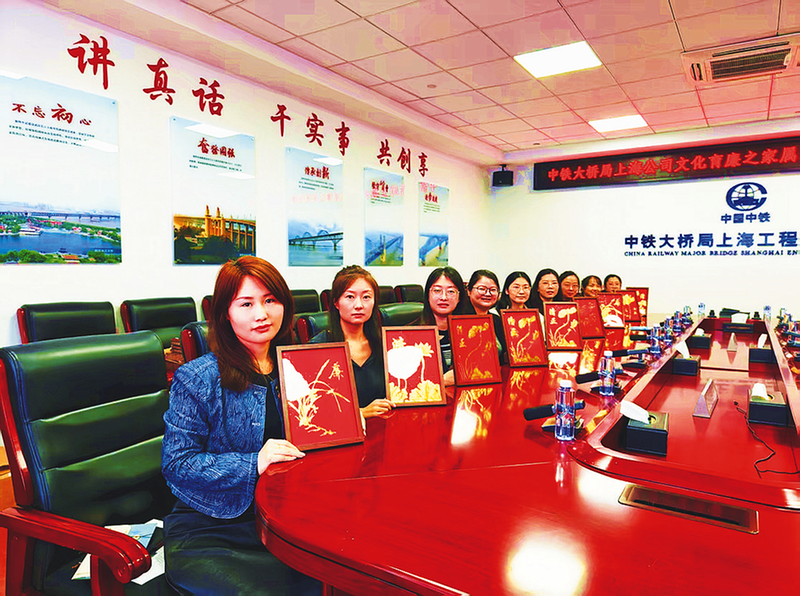 ??10月31日,中鐵大橋局上海公司紀委開展“文化育廉之家屬助廉、員工踐廉”主題活動?;顒影捔L、讀廉書、送家書、寄廉語、守廉心等環節,旨在進一步凝聚家庭助廉力量,推動廉潔文化進家庭。圖為員工家屬展示創作的蘊含廉潔意境的金箔畫。?胡駿 攝