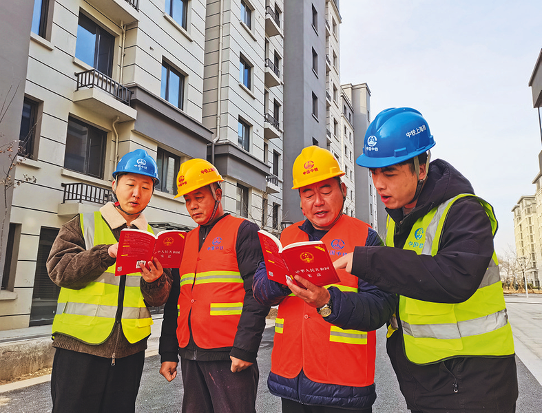 ??12月4日,中鐵上海局建筑公司沛縣昭陽雅居項目部開展“普法進工地 安全伴我行”主題活動,組織黨員干部為產(chǎn)業(yè)工人解讀憲法中關(guān)于勞動者權(quán)益保障、安全生產(chǎn)責(zé)任等條款,幫助他們增強法律意識。?朱立飛 攝