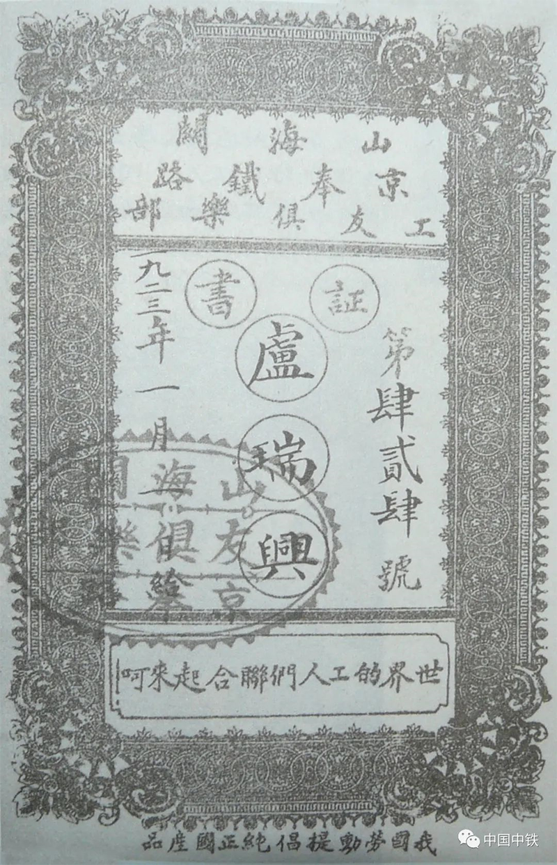 山海關(guān)京奉鐵路工友俱樂部證書