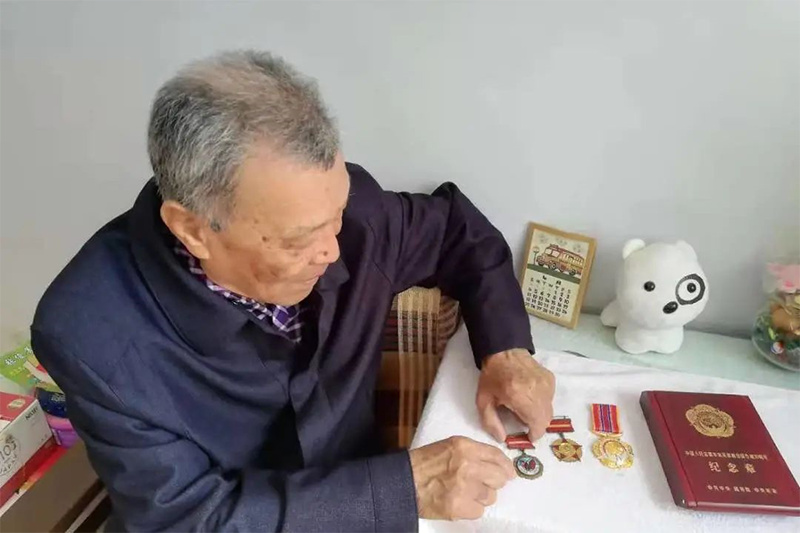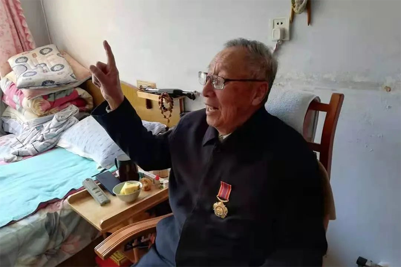 這位老人是中國中鐵九局七公司離退職工,他叫王俊起,1951年8月1日參加抗美援朝。戰爭時期,他在五木里,白天負責看守防空電話,晚上負責鐵路接車,充當搶修隊的“眼睛”和火車的“引路人”。期間,他在防空洞里,一住就是三年。