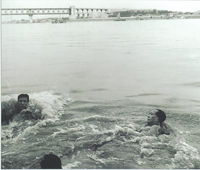 匯報結束后,毛主席休息了一會就開始下水游泳,并多次穿過水流湍急的橋墩附近。那里停泊著不少正在施工的吊船、駁船,水中布有不少錨鏈,他泰然自若地游了過去。暢游長江后,毛主席興致未盡,于6月2日揮毫寫下了《水調歌頭·游泳》。